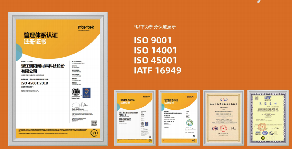 始終嚴(yán)格把控產(chǎn)品質(zhì)量的潤(rùn)陽(yáng)科技在近十年的耕耘下,也交出了一份高質(zhì)量的發(fā)展答卷。在標(biāo)準(zhǔn)化管理方面,潤(rùn)陽(yáng)科技達(dá)到了國(guó)家標(biāo)準(zhǔn),并正式獲得ISO:9001、ISO:14001、ISO:45001、IATF:16949等體系認(rèn)證;在產(chǎn)品質(zhì)量方面,潤(rùn)陽(yáng)科技憑借高質(zhì)量技術(shù)和專業(yè)工藝流程,賦予產(chǎn)品更多樣化的性能,能夠滿足各行業(yè)客戶的高標(biāo)準(zhǔn)要求。